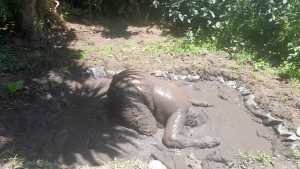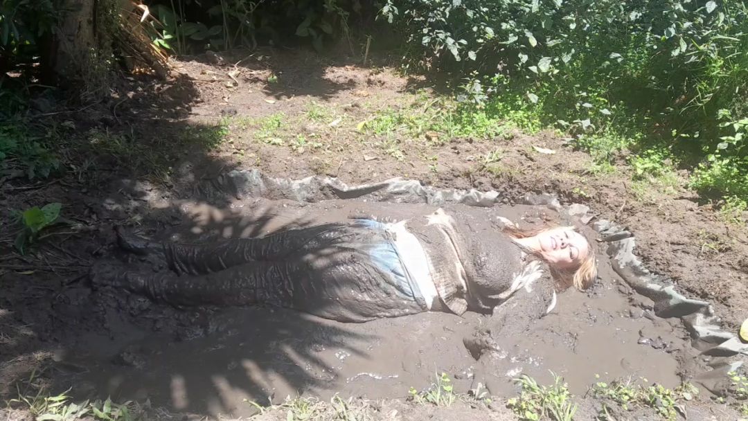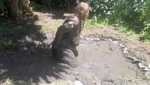 Dress in blue jeans and a cream sweater, I get into the mud pit and mix it up good and proper, before I start covering myself in mud. But to get completely covered, I lay on my back and pile mud ontop of me before rolling over onto my tummy and getting more covered. I then strip the jersey off and go completely topless, and allow my breasts to swing through the mud and then dunk my head a few times, ensuring I am literally covered in all the right places.