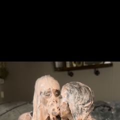 Sexy schoolgirl gets lots of pies on the bed while flashing the camera.