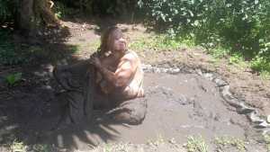 Dressed in a formal black dress and blue formal shawl/blouse, I enter the mud pit barefoot, getting my feet nice and muddy before covering myself in mud.