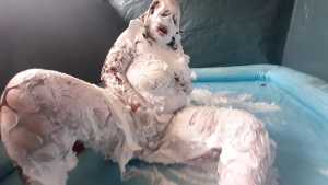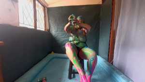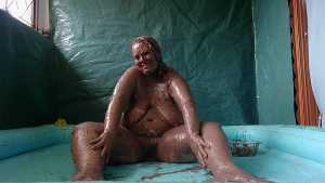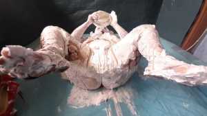 Wow! We finally get to see Darkabyss' beautiful double D breasts in the flesh, natural with nothing on them before getting gunged and slimed. The scene starts off with her showing off her luscious body and curves as she shows off her bare feet stepping into a tub filled about 1/4 of the way with gunge. She is wearing nothing but panties--hopefully some day we'll have a chance to see her rocking body completely nude! After playing around in the slime with her bare legs she begins to pie herself on the face and rub the cream all over her beautiful face, hair and awesome breasts! One can bring themselves to an explosive orgasm as they masturbate fantasizing about joining Darkabyss nude in her tub full of gunge and creamy mess! Lastly she pours a bucket of melted chocolate over her head and continues to frolic and enjoy her naughty mess in her tub!